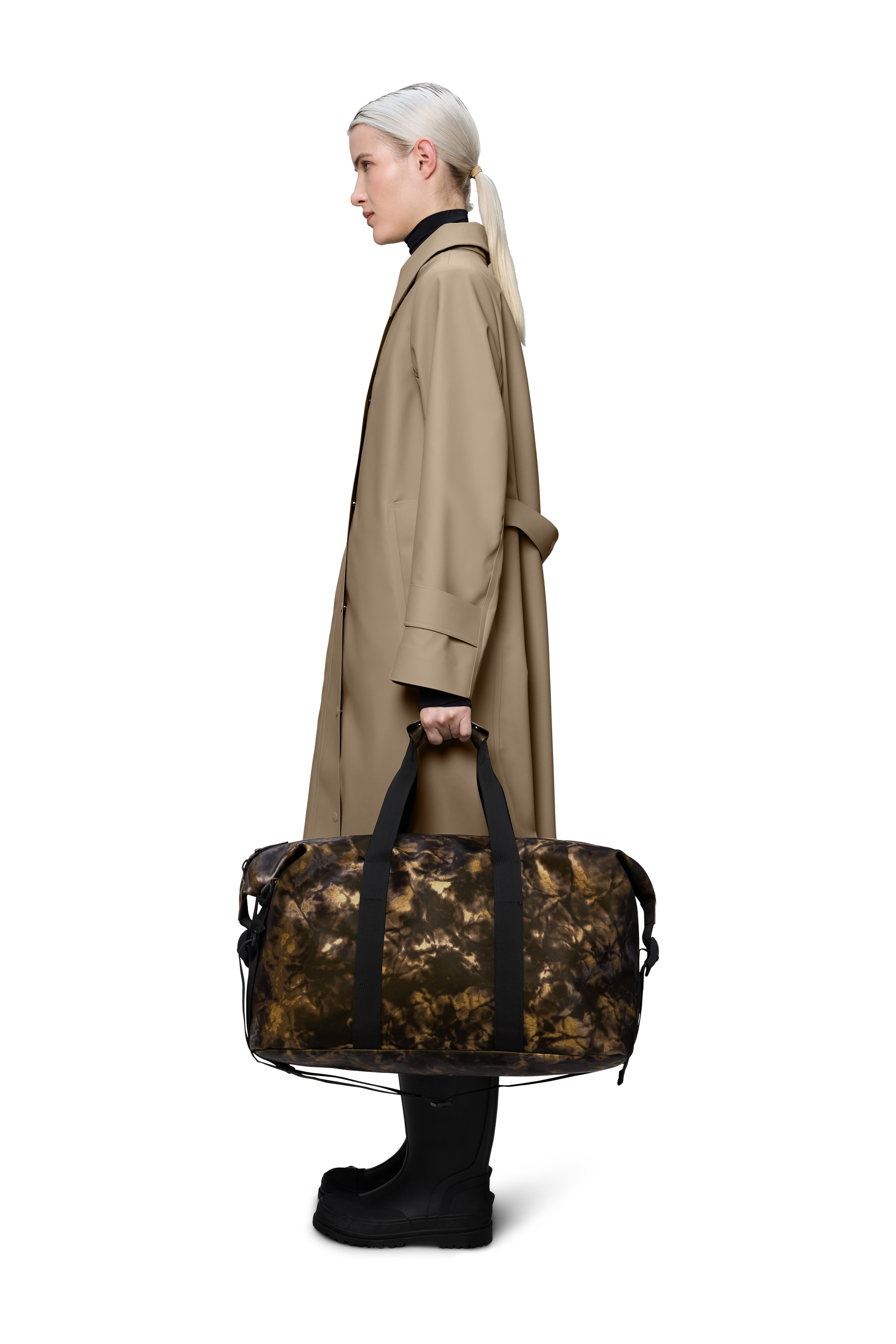Hilo Weekend Bag is cut from Rains’ signature waterproof PU fabric, engineered for carrying strength, durability, and a smooth feel.