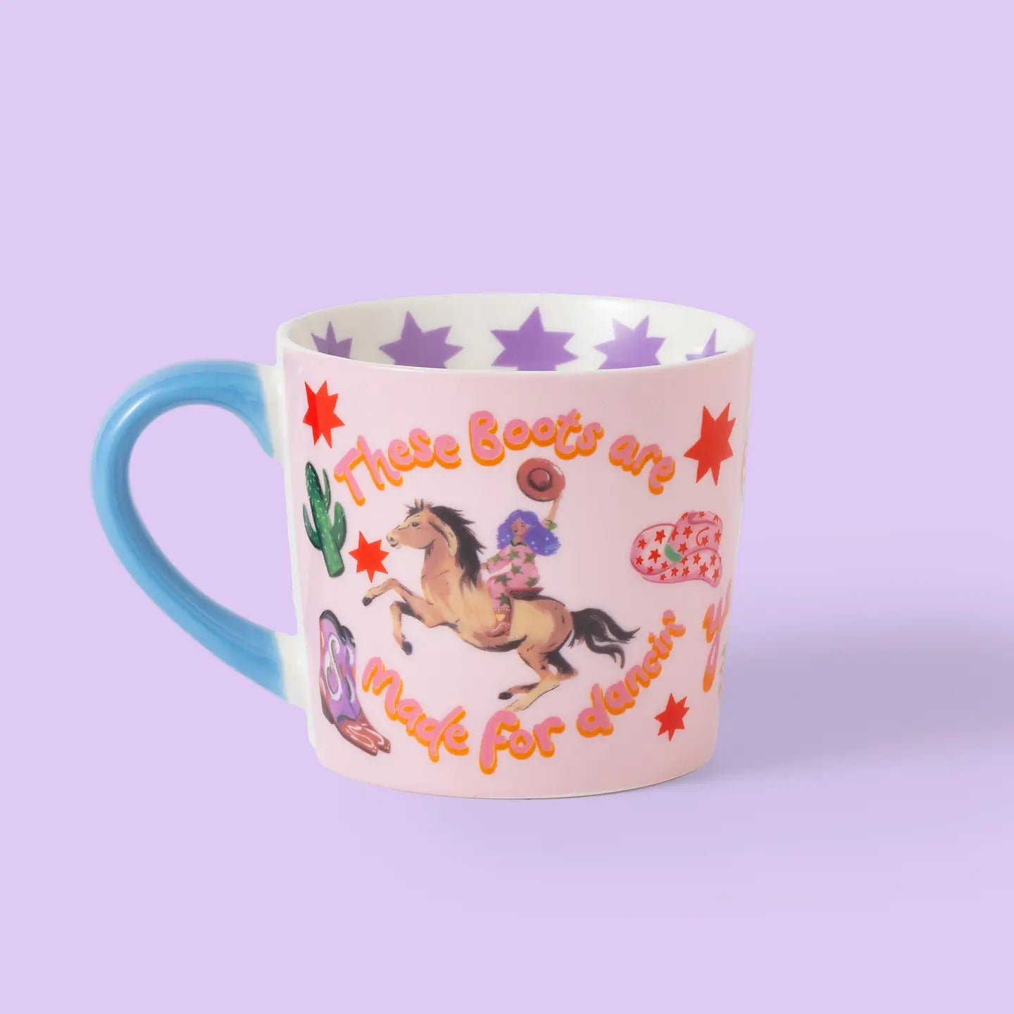 This bold and charming mug is a daily reminder that life’s better when you dance through it - boots on, hat held high, and heart full. Perfect for dreamers, doers, and dancers at heart. Product Specifications: * 300ml capacity * Approx. dimensions H 8.5cm x Dia. 9.5cm * Made from premium new bone china, an animal-free alternative to traditional bone china